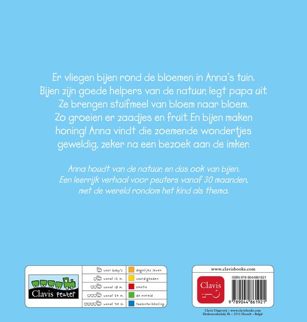 Er vliegen bijen rond de bloemen in Anna’s tuin. Bijen zijn goede helpers van de natuur, legt papa uit. Ze brengen stuifmeel van bloem naar bloem. Zo groeien er zaadjes en fruit. En bijen maken honing! Anna vindt die zoemende wondertjes geweldig, zeker na een bezoek aan de imker. Anna houdt van de natuur, en dus ook van bijen.