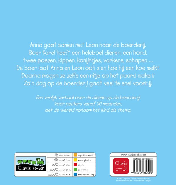 Anna gaat samen met Leon naar de boerderij. Boer Karel heeft een heleboel dieren: een hond, twee poezen, kippen, konijntjes, varkens, schapen … De boer laat Anna en Leon ook zien hoe hij een koe melkt. Daarna mogen ze zelfs een ritje op het paard maken! Zo’n dag op de boerderij gaat veel te snel voorbij … Een vrolijk verhaal over de dieren op de boerderij.