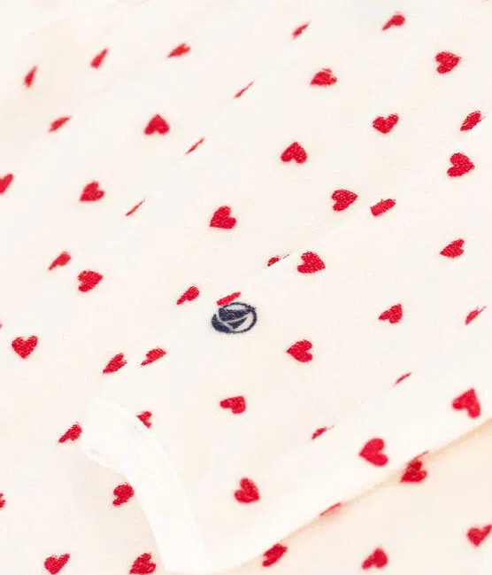 Fluwelen pyjama met voetjes en een lieve hartjesprint. Gemaakt uit organisch katoen.