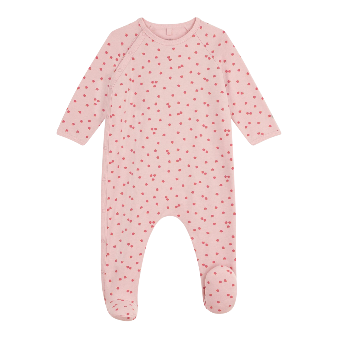 Zachte babypyjama met voetjes, gemaakt uit biologisch katoen.
