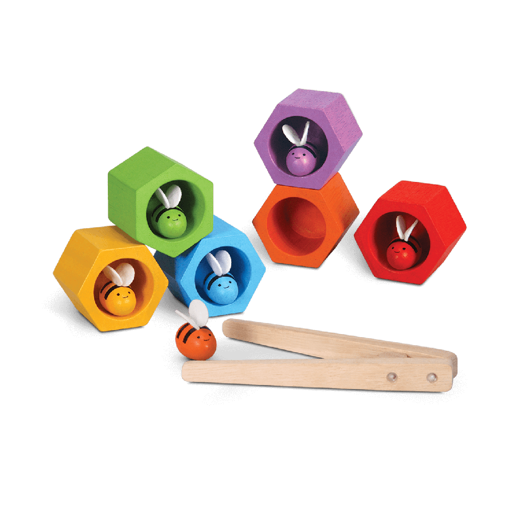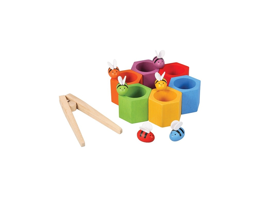 Deze bijenkorf helpt de fijne motoriek te ontwikkelen. Het verbetert ook de kleurherkenning en tellen.