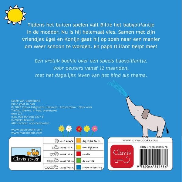 Tijdens het buiten spelen valt Billie het babyolifantje in de modder. Nu is hij helemaal vies. Samen met zijn vriendjes Egel en Konijn gaat hij op zoek naar een manier om weer schoon te worden. En papa Olifant helpt mee! Een vrolijk boekje over een speels babyolifantje. Voor peuters vanaf 12 maanden, met het dagelijks leven van het kind als thema.