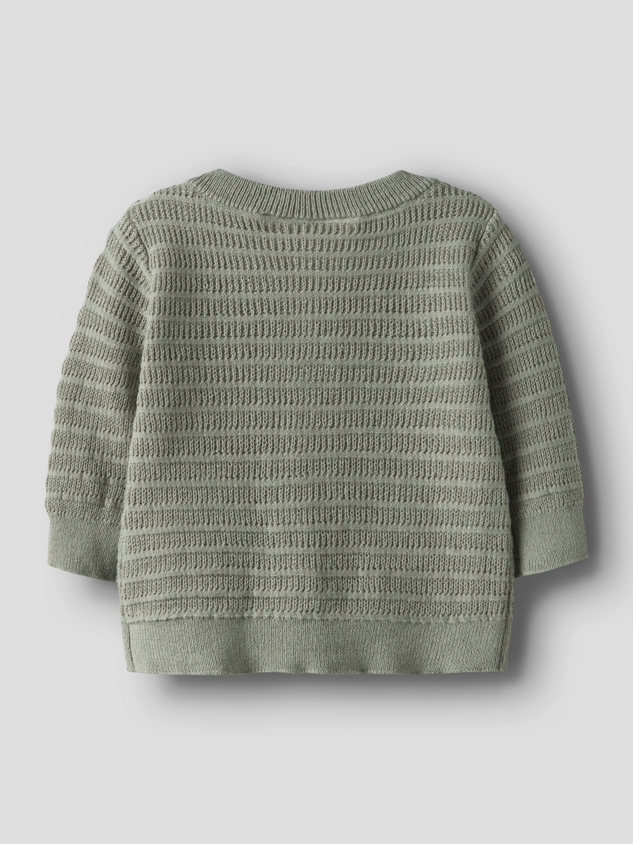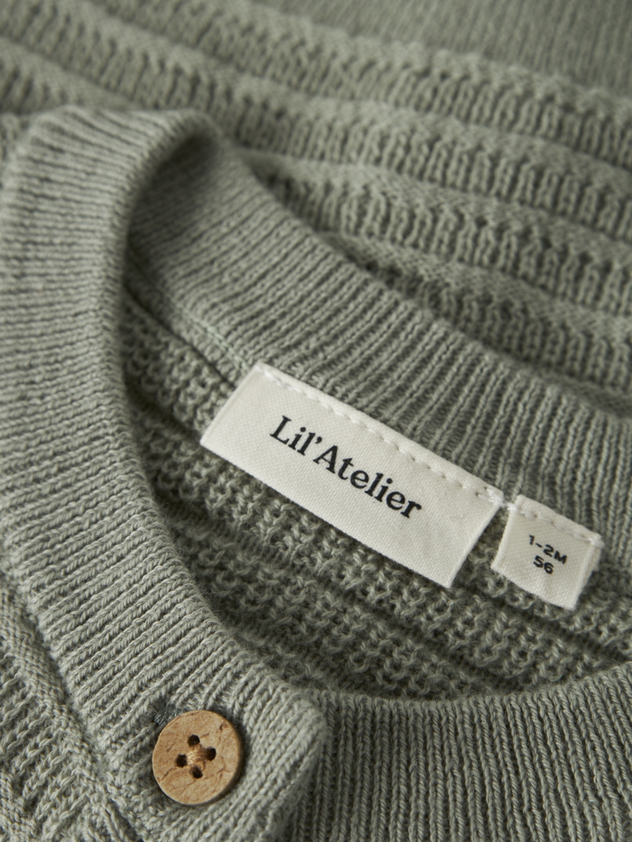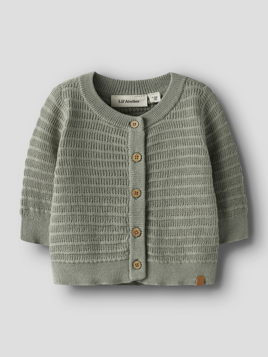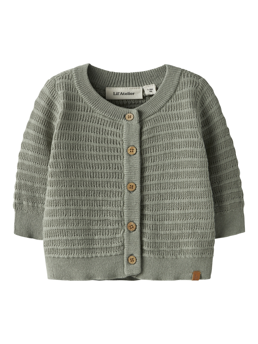Mooie, zacht groene fijnbrei cardigan van Lil’ Atelier.