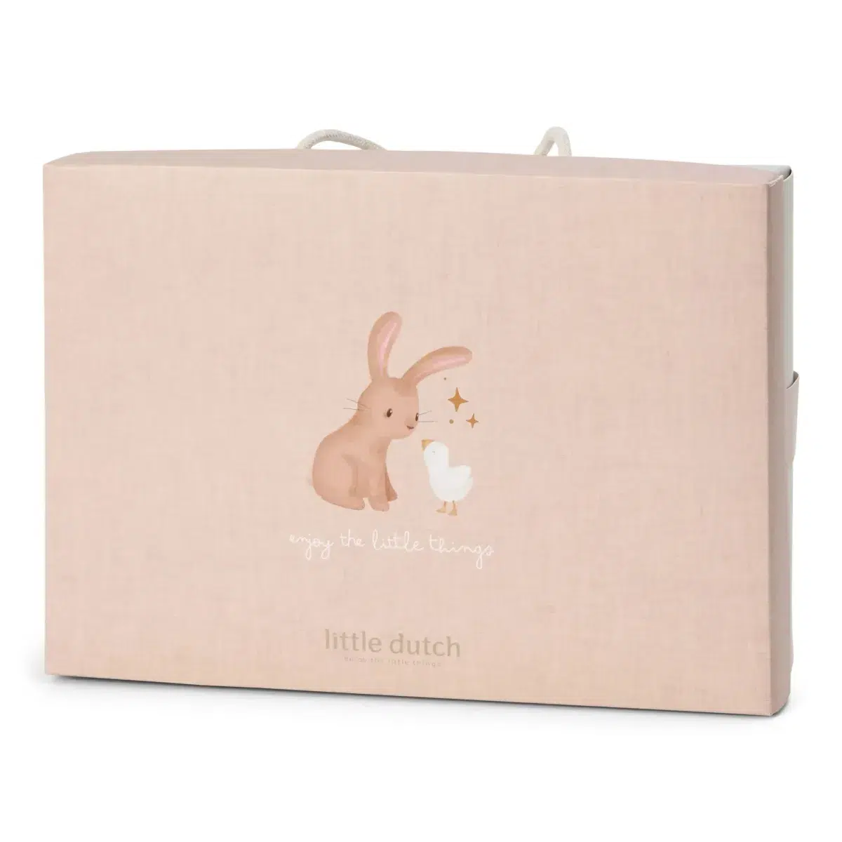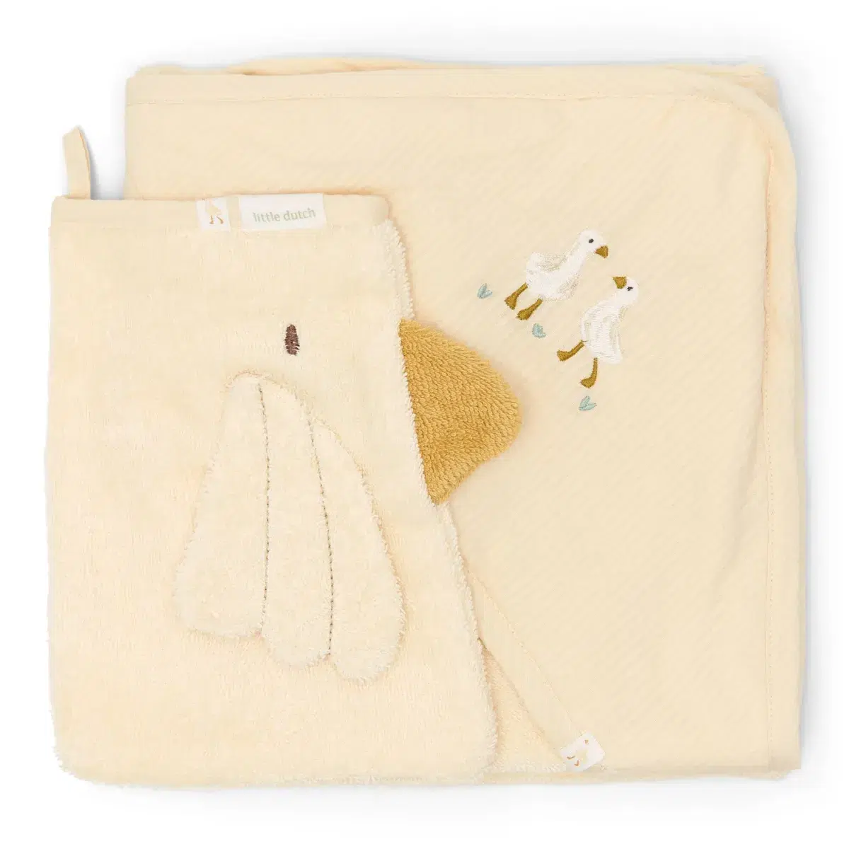 Het perfecte cadeau voor iemand die een baby verwacht of heeft gekregen. Of verwen je kleintje (en jezelf) met deze schattige cadeaubox! Deze set bevat een heerlijk zachte washand in de vorm van een gans – ja, je leest het goed, een gans. En een badcape met lief ganzenborduursel, perfect voor na het badderen. De luxe cadeauverpakking is niet alleen superleuk, maar ook handig om te bewaren. Wie weet wordt het de perfecte plek voor alle speciale herinneringen van de kleine.