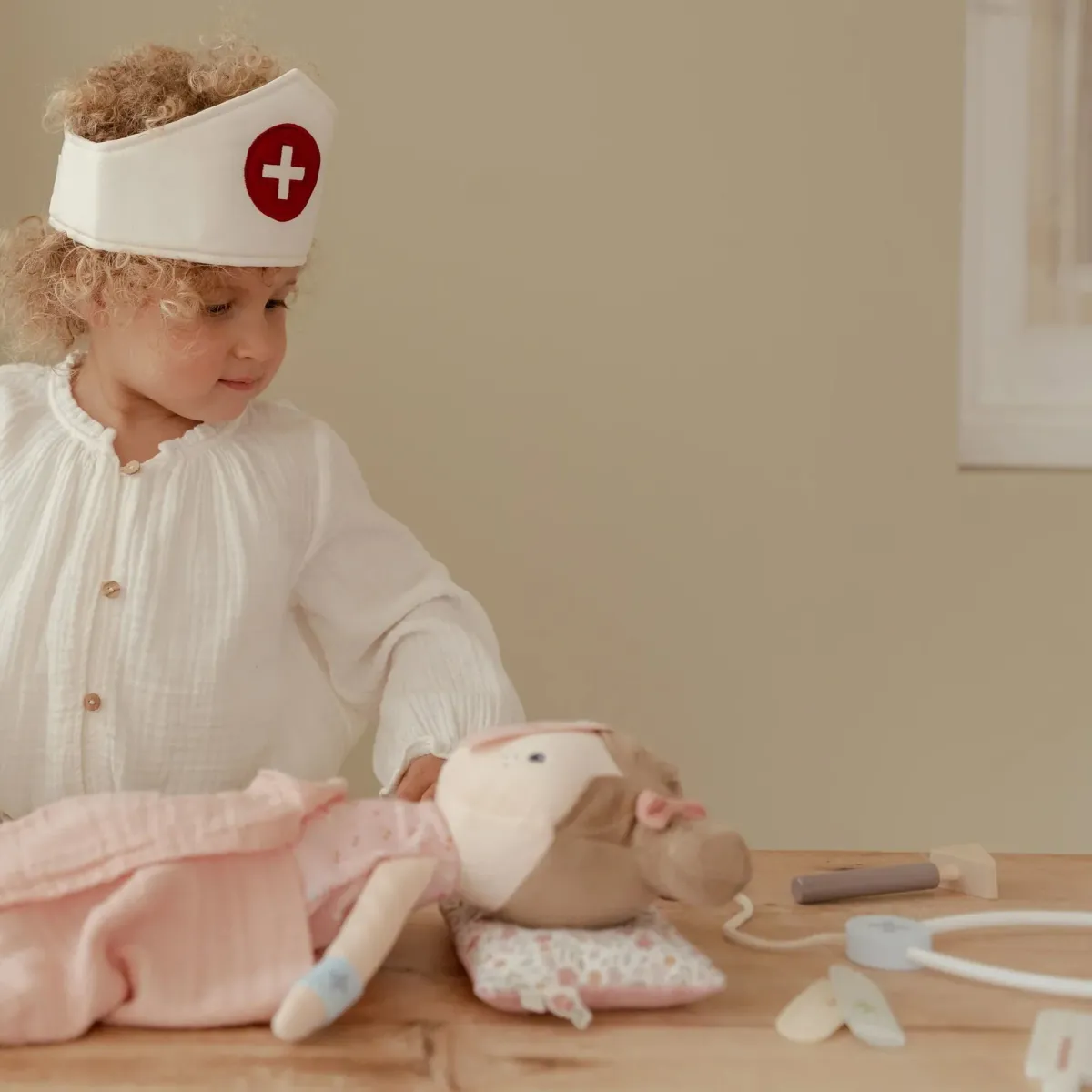 Dokter, kunt u even kijken? Met deze complete houten doktersset is jouw kleintje helemaal klaar om patiëntjes te verzorgen. In het stoffen dokterstasje zitten alle essentiële medische hulpmiddelen, zoals een thermometer, spuitje, pleisters, stethoscoop en bloeddrukmeter. Zelfs een doktersmutsje ontbreekt niet! Perfect voor fantasierijk rollenspel en het vertrouwd raken met doktersbezoekjes. Wie is de volgende patiënt?