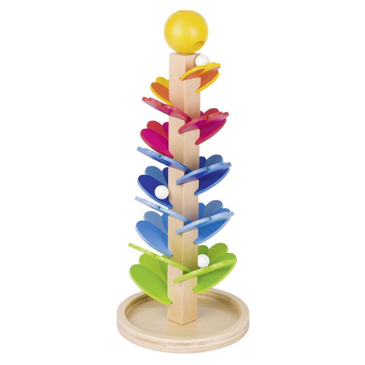Houten toren met 3 knikkers. Laat de knikker bovenaan vertrekken en geniet van de geluiden die hij maakt onderweg naar beneden.
