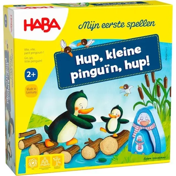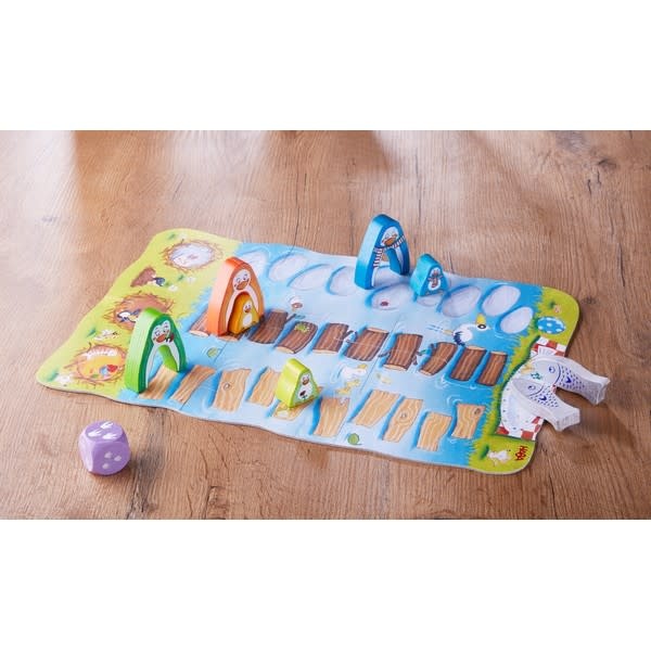 De pinguins kijken heel erg uit naar de vis-picknick, maar die is helemaal aan de overkant van het water! Kun jij jouw kind- en ouderpinguin het snelst naar de overkant helpen? Uit het water steken namelijk genoeg stenen, boomstammen en planken om veilig de oversteek te maken. Rol de dobbelsteen en zet het aantal stapjes wat je rolt. Wie als eerste zowel ouder als kind aan de overkant heeft is de winnaar! Dit spel is zeer geschikt om kinderen te leren spelen in spelverband. Elementen als op je beurt wachten, volgens de regels spelen en leren omgaan met winnen en verliezen komen allemaal aan bod. Maar wat nog veel belangrijker is, is dat het vooral een erg leuk spel is om te spelen!