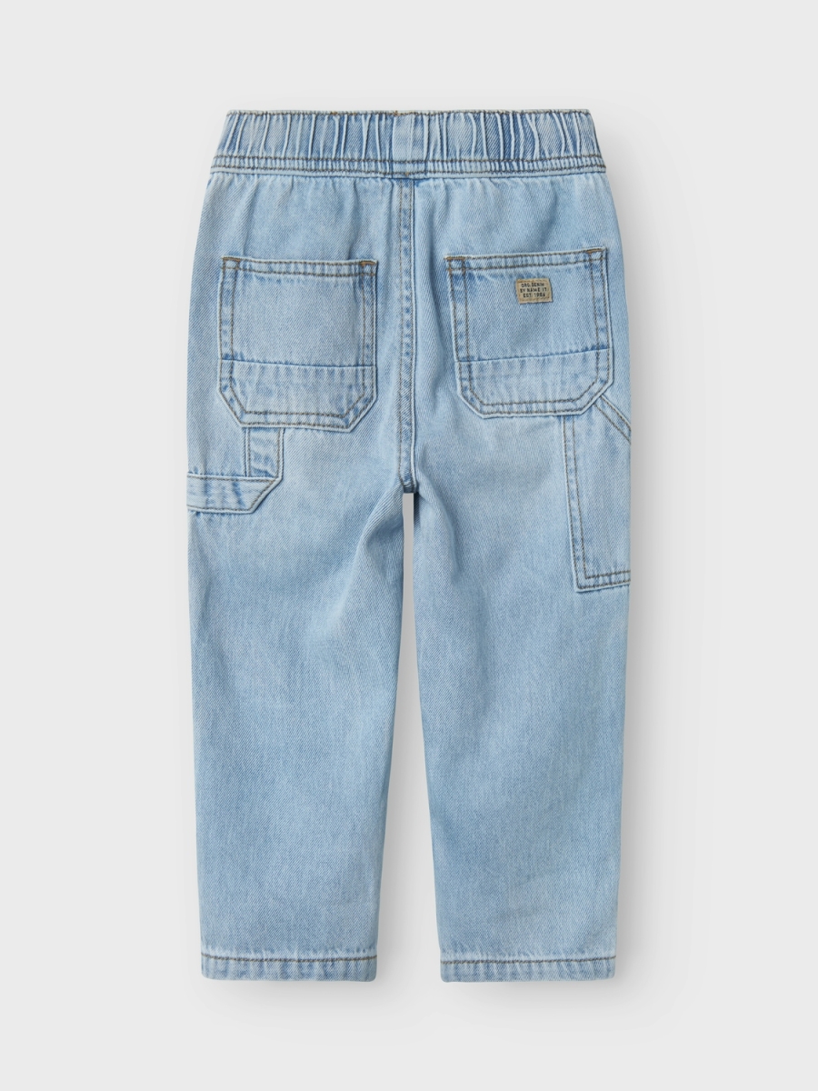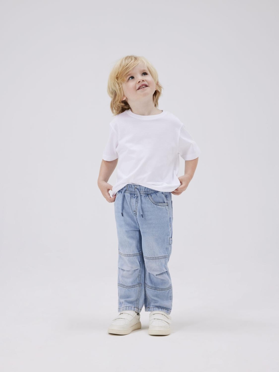 Stoere broek met leuk plooidetail vooraan. Deze broek sluit bovenaan met een elastiek (de touwtjes zijn voor de sier) en kan versmald worden op de heup met elastiekjes.Â
