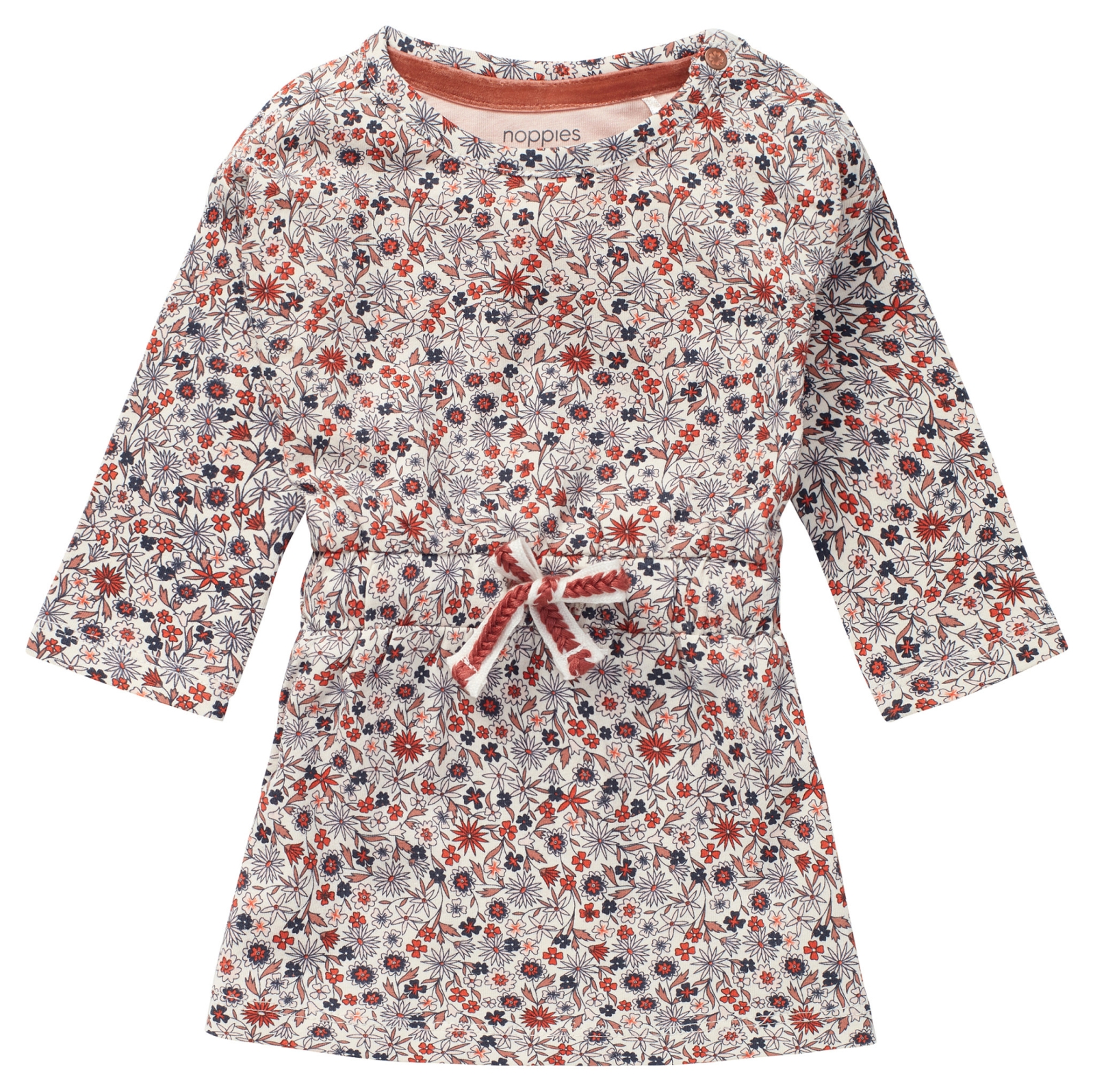 Schattig bloemenjurkje met lange mouwen uit de Noppies Baby collectie. Jurkje Abohar heeft een elastische taille met striklint en een handig drukknoopje in de halslijn om het aan- en uittrekken net even makkelijker te maken. Het striklint is zo gemaakt dat het er tijdens het aansnoeren niet uit kan schieten. Handig! De stretch in de zachte stof zorgt voor extra veel comfort.