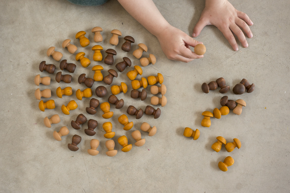 Set met 36 houten paddestoelen.