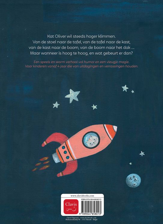 Kat Oliver wil steeds hoger klimmen. Van de stoel naar de tafel, van de tafel naar de kast, van de kast naar de boom, van de boom naar het dak … Maar wanneer is hoog te hoog, en wat gebeurt er dan? Een speels en warm verhaal vol humor en een vleugje magie. Voor kinderen vanaf 4 jaar die van uitdagingen en verrassingen houden.