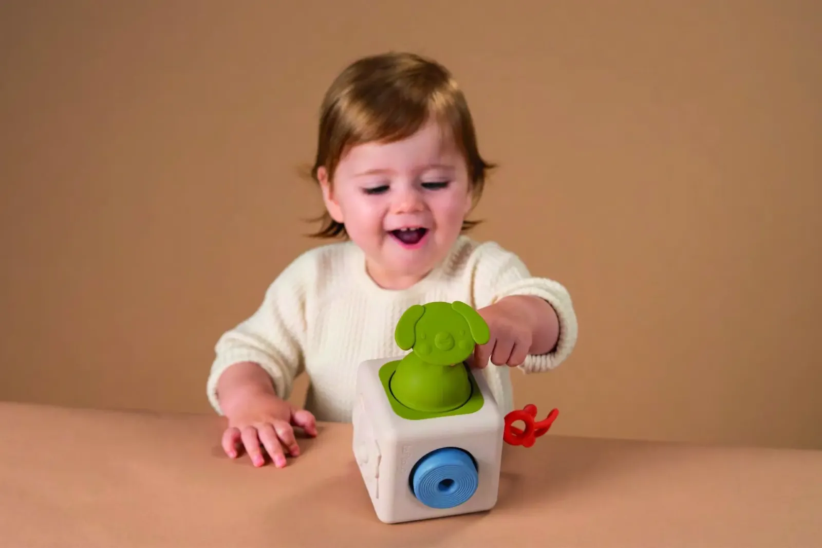 Eindeloos speelplezier met de Peek & Play Silicone Cube, ontworpen voor nieuwsgierige kleine ontdekkers vanaf 6 maanden! Elke kant nodigt uit tot een nieuw avontuur: een grote pop-it met een speels hondengezicht, twee vormsorteerpanelen voor hands-on leren, een siliconen trekkoord met zuignap voor oorzaak-en-gevolgplezier, een geïntegreerde beer voor zintuiglijke verkenning en een draaiende kralenbal die kleine handjes bezig houdt. Deze boeiende kubus stimuleert de fijne motoriek, het oplossen van problemen en de zintuiglijke ontwikkeling, allemaal door middel van vrolijk spelen!