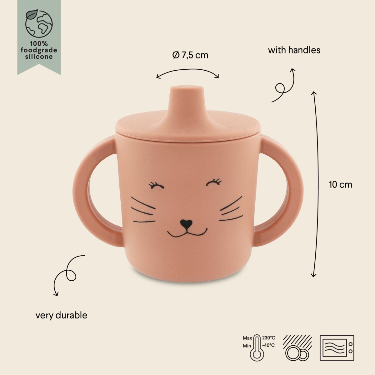Door de grote handvatten kunnen kinderen met deze beker oefenen op het vasthouden en het kantelen van een beker. Met deze drinkbeker kan dat zonder te morsen, wat vooral handig is als je onderweg bent. Silicone is een geweldig materiaal om te gebruiken in de keukenomgeving. Het breekt niet en is veilig te gebruiken in de magnetron, vaatwasser, vriezer en oven. Zelfs bij intensief gebruik blijft het servies goed in vorm en kan het gemakkelijk worden doorgegeven aan kleine broertjes, zusjes of vrienden.