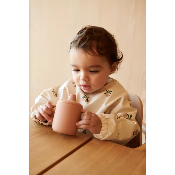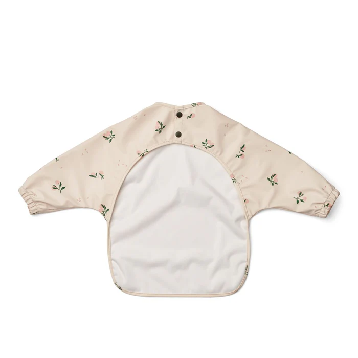 Lichtgewicht slabbetje met mouwen voor kinderen die leren eten. Het gerecyclede materiaal maakt het direct herbruikbaar: gewoon afspoelen en schoonvegen.