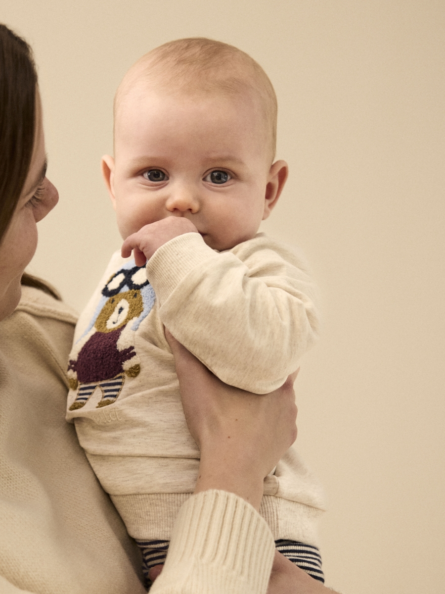 Leuke sweater met geborduurde beer vooraan. Gemaakt uit 95% organisch katoen en 5% elastaan.
