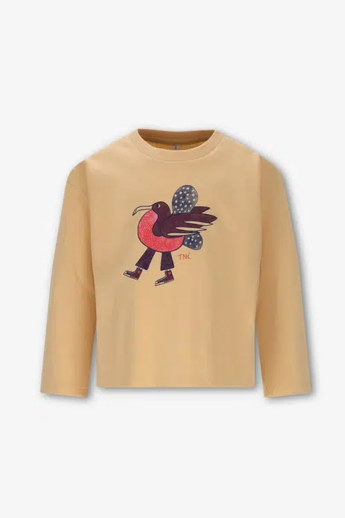 De donkergele Mattie longsleeve is een vrolijke toevoeging aan de garderobe. Gemaakt van zacht en duurzaam katoen en voorzien van een opvallende print van een vogel op de borst. De kleuren en illustratie geven de longsleeve een speelse, leuke uitstraling.