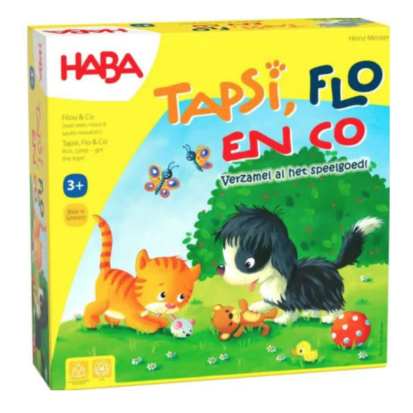 Tapsi, Flo, Tine en Flocke gaan heerlijk in de tuin spelen! De puppy’s en kittens spelen haasje over, en iedere keer als ze iemand passeren, dan verdienen ze daar een speeltje mee. Rol met de dobbelsteen, en verplaats jouw puppy of kitten naar het eerstvolgende vakje met de zelfde kleur. Ga je voorbij een van de andere spelers? Dan mag je een speeltje van de stapel pakken en in je mandje leggen. Als alle speeltje verdeeld zijn, dan kun je het bord omdraaien en de speeltjes voor de mandjes uitstallen, zodat je (zonder te tellen) gemakkelijk kunt zien wie de meeste speeltjes heeft verzameld en heeft gewonnen!