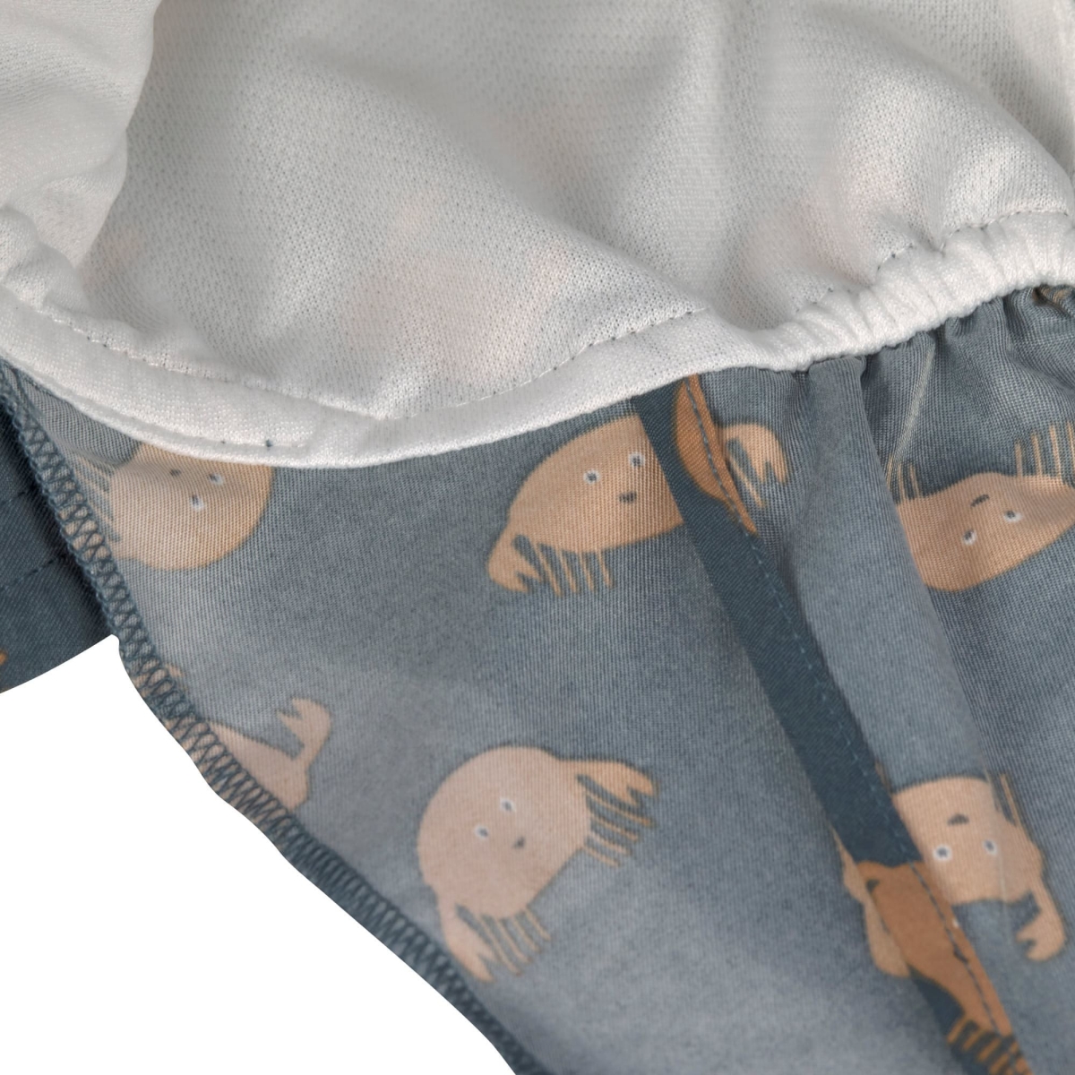 Om ervoor te zorgen dat de muts niet verdwaalt als het waait of tijdens het ravotten, kan hij ook onder de kin van het kind worden vastgebonden. Niets staat het plezier in het water dus in de weg.
